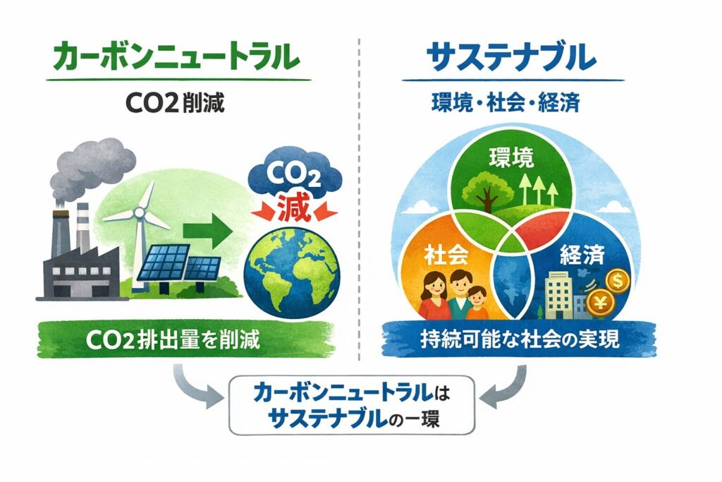 「カーボンニュートラル」と似た言葉に「サステナブル」がありますが、