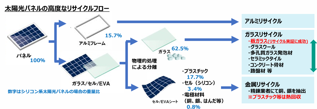 リサイクルの基本は、パネルに含まれるガラス、アルミニウム、シリコン、貴金属、アセテート系樹脂などの資源を分離・回収することです。
