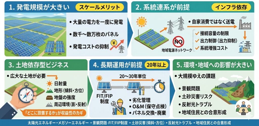 メガソーラーには、住宅用や産業用とは異なる特性があります。